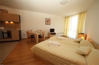 The standard studios, located in the separate sections of the resort, provide a quiet and practical accommodation option. Each studio includes a kitchenette, an entrance hall, a living area with upholstered furniture and a TV, a sleeping area with two separate beds, and a functional bathroom. These studios are suitable for guests looking for a comfortable and peaceful stay.
